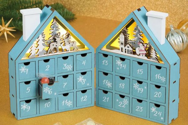 温かなライトでサンタやトナカイを照らす木製の引き出し型。