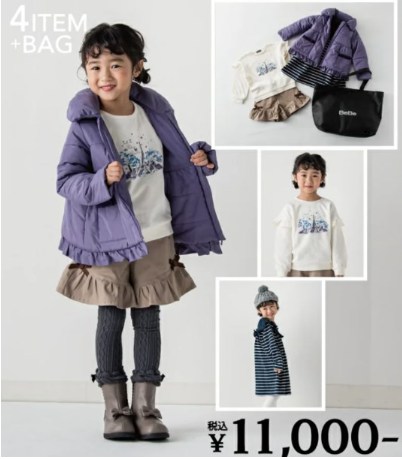 - 内容(女の子):中綿コート、ワンピース、トレーナー、ショートパンツ、不織布バッグ(計4点+バッグ)