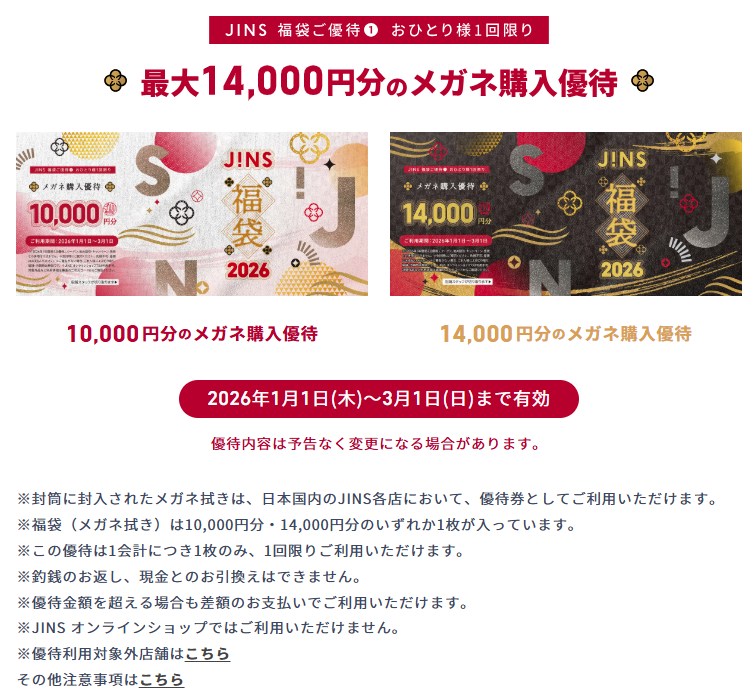 - 封入:10,000円 or 14,000円の「メガネ購入優待」(いずれか1枚/1会計1回限り)