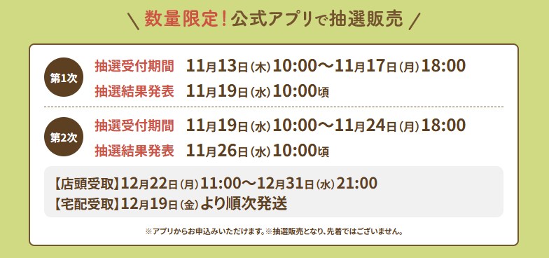 ・冬:公式アプリ抽選、店頭または宅配、販売数量35,000個
