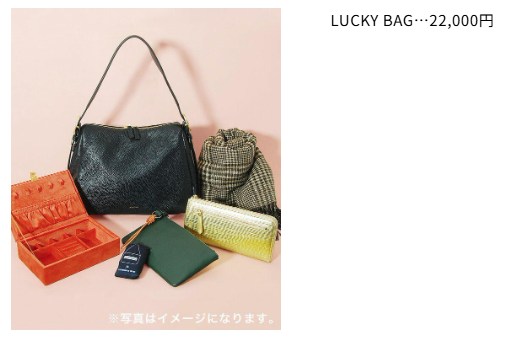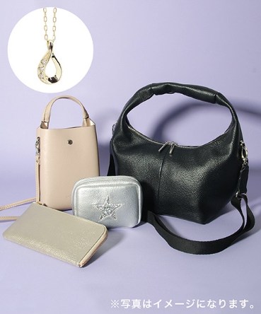 • 22,000円(税込):計6点(例:レザーバッグ/ウォレット/ジュエリーボックス/ストール/レザーポーチ/エコショルダーバッグ)