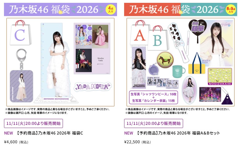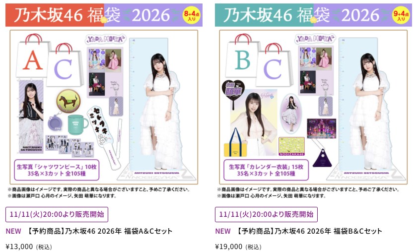 - Aは現地定番アイテム一式で“初めての乃木坂福袋”に最適。